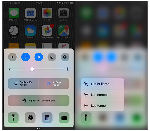La aplicación Linterna es quizás una de las más útiles que puede llevar un móvil. ¿Quién no la ha utilizado en alguna ocasión? En iOS 10 podemos configurar la intensidad de la luz que emite el flash en esta app. Para hacerlo usaremos la magia del 3D Touch. Primero sacaremos el “Centro de control” deslizando hacia arriba desde abajo del todo. Una vez aquí, presionaremos con fuerza sobre el icono de la linterna. La aplicación nos ofrecerá tres modos de luz. - Activar temporizador de forma rápida: