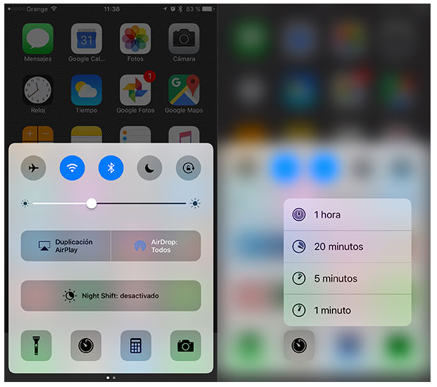 Al igual que podemos cambiar la intensidad de la linterna, podemos activar el temporizador. Desde el mismo “Centro de control”, pulsaremos fuerte sobre el icono del temporizador. Si lo hemos hecho bien nos saldrá un pequeño menú con cuatro opciones de tiempo. - Cambiar modo desbloqueo con Touch ID