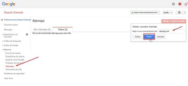 - Ahora debes enviar el sitemap de la nueva propiedad que acabas de crear. Ahí mismo el Search Console en el apartado de «sitemap«.