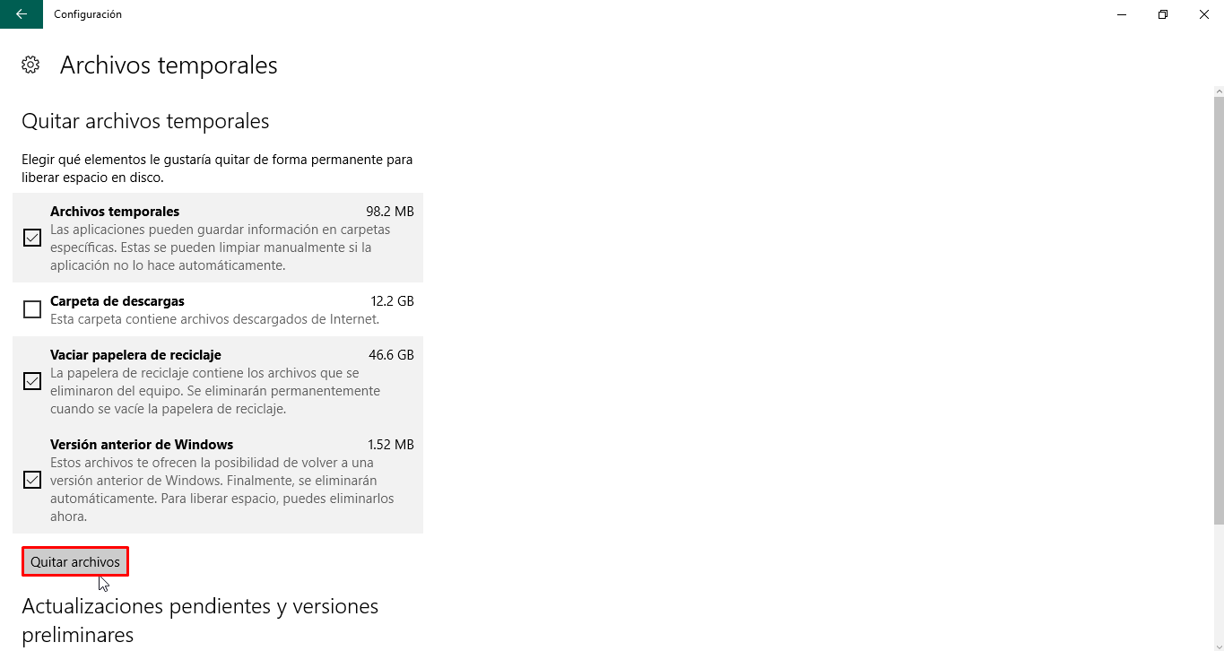 Como te puedes dar cuenta aquí se ve el espacio ocupado en nuestro disco por este tipo de archivos. Procedemos a marcar la casilla de los archivos temporales. Si queremos también podemos marcar la casilla de papelera de reciclaje y versión anterior de Windows. Clic sobre el botón de «Quitar archivos«.