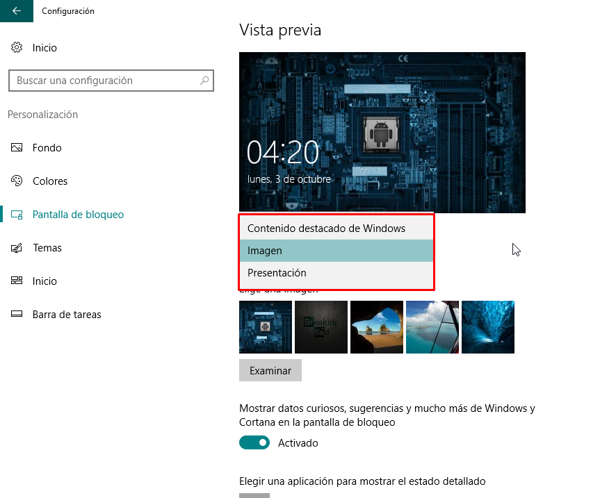 Ahora clic sobre «Pantalla de bloqueo» que se encentra en las opciones del lado izquierdo de la pantalla.