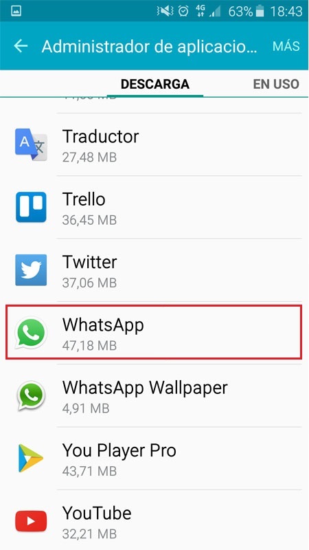 - Una vez dentro de la opción procedemos a buscar la aplicación WhatsApp y clic sobre ella abrir los ajustes para esa aplicación.