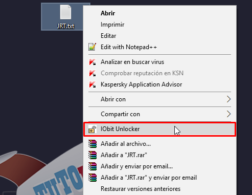 - Ahora identifica algún archivo o carpeta que no puedas eliminar de forma tradicional, selecciónalo da clic derecho y elige «IObit Unlocker» para que se abra con ese programa.