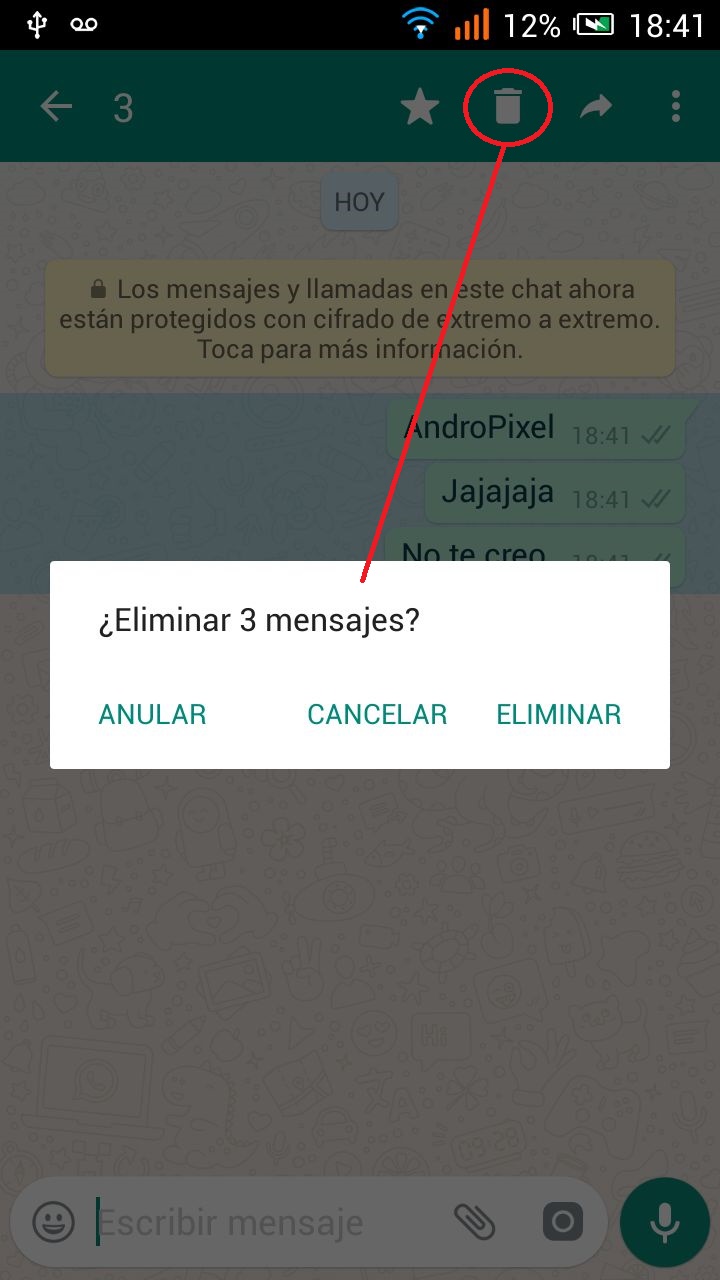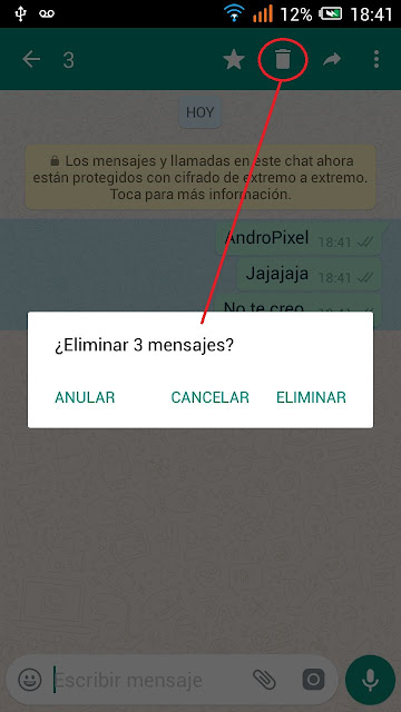 - Ahora en el WhatsApp normal se agregaran dos opciones más a la hora de eliminar un mensaje. Cuando hayas enviado un mensaje y lo quieras anular mantén pulsado el texto, seleccionamos la papelera y en la ventana emergente elegir «Anular«.
