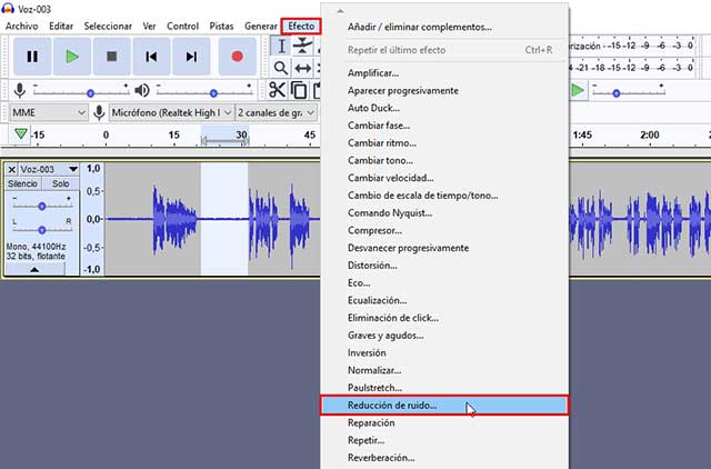 5. Selecciona todo el audio dando doble clic sobre él. Vuelve a realizar lo mismo que el paso anterior; clic en «Efecto» y selecciona «Reducción de ruido«. Asegúrate que este marcada la casilla «Reducir» y sin mover nada vamos a dar clic en el botón de «Aceptar«.
