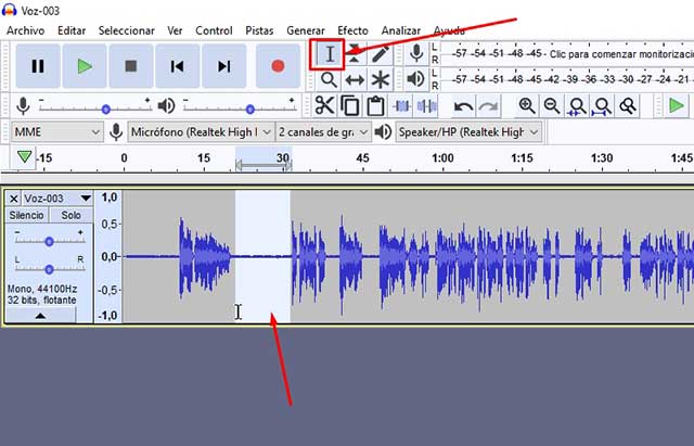 3. Reproduce tu audio y debes detectar alguna zona donde solo este el ruido [solo el puro ruido de fondo para no afectar la voz del audio]. Selecciona la zona identificada [asegúrate de tener la herramienta de selección].