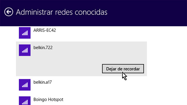 Una vez estando en la configuración de las redes conocidas es ahí donde están los perfiles de las redes wifi. Para eliminar o dejar de recordar un perfil solo damos clic sobre cualquier red wifi y después en «Dejar de recordar«.