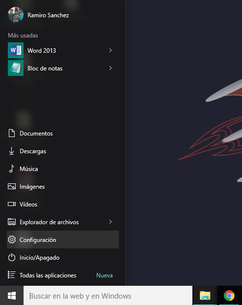 El primer paso es acceder a las configuraciones de Windows 10. Para esto tenemos que dar clic al botón Inicio de Windows y después clic en el icono de «Configuración«.