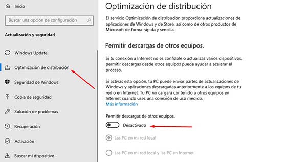 En actualizaciones recientes de Windows 10 esta opción la podemos encontrar en el apartado de «Optimización de distribución«. En la sección de la derecha se muestra como «Permitir descargas de otros equipos«. Dicha opción esta esta activa, para desactivar solo dar clic en el interruptor.