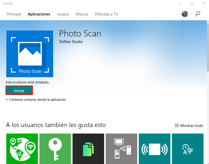Lo primero que hay que hacer es irnos la link que deje en la parte de arriba y te llevará a la tienda de Windows donde se encuentra la aplicación de Photo Scan. Aquí vamos a dar clic sobre el boto azul que dice «Instalar» u «Obtener la aplicación«.