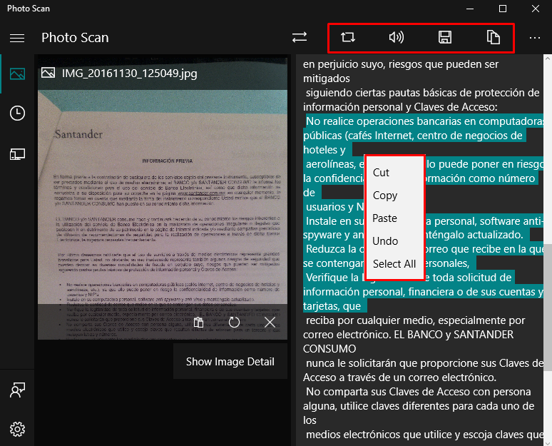 Una opción que llama mucha la atención y es muy curiosa, es la de que la propia aplicación Photo Scan nos lea el texto extraído de la imagen en voz alta. Sin duda alguna es algo genial poder contar con esta aplicación en la computadora.