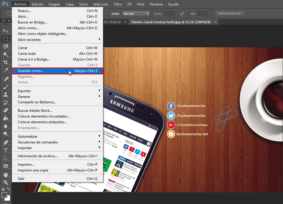 - Cuando tengas un proyecto ya echo en Photoshop y quieres exportarlo en formato de imagen vamos a dar clic sobre la opción de «Archivo» y en las opciones que se muestran vamos a elegir la de «Guardar como…» o también podemos usar la combinación de botones Mayús+Ctrl+S.