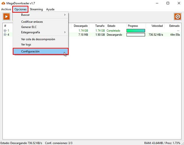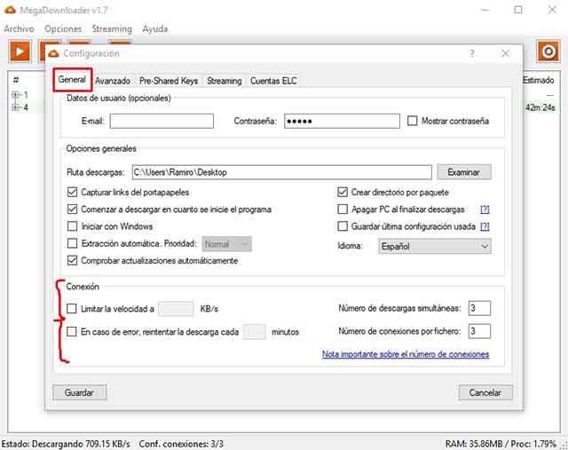 Para hacer que MegaDownloader descargue lento [restringir la velocidad de descarga]. Vamos a configurar un poco las opciones. En el apartado de las conexiones es donde haremos la magia.
