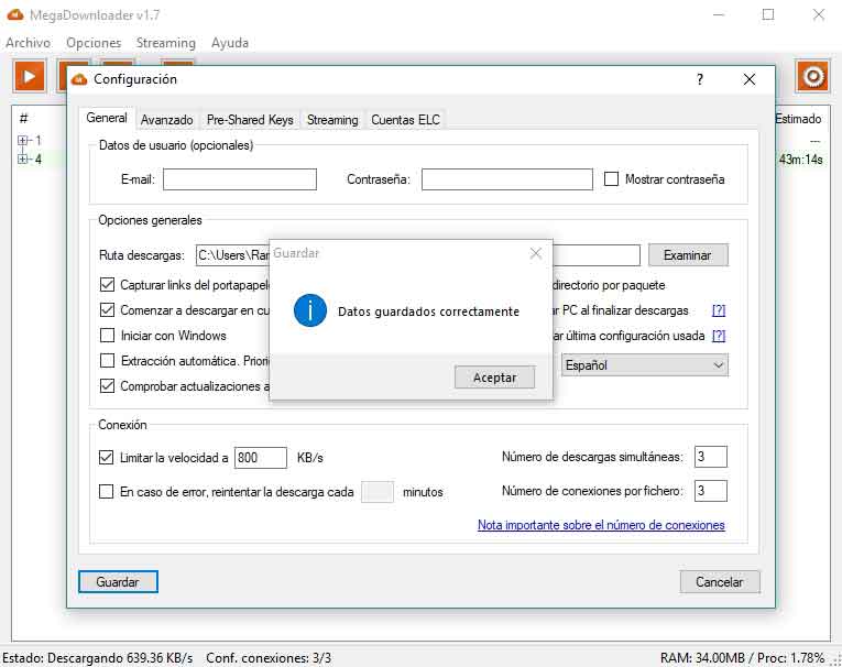 Si queremos configurar megadownloader para descargar sin limite no es necesario hacer nada de cambios. Basta con mantener la configuración que viene por defecto para tener la máxima velocidad.
