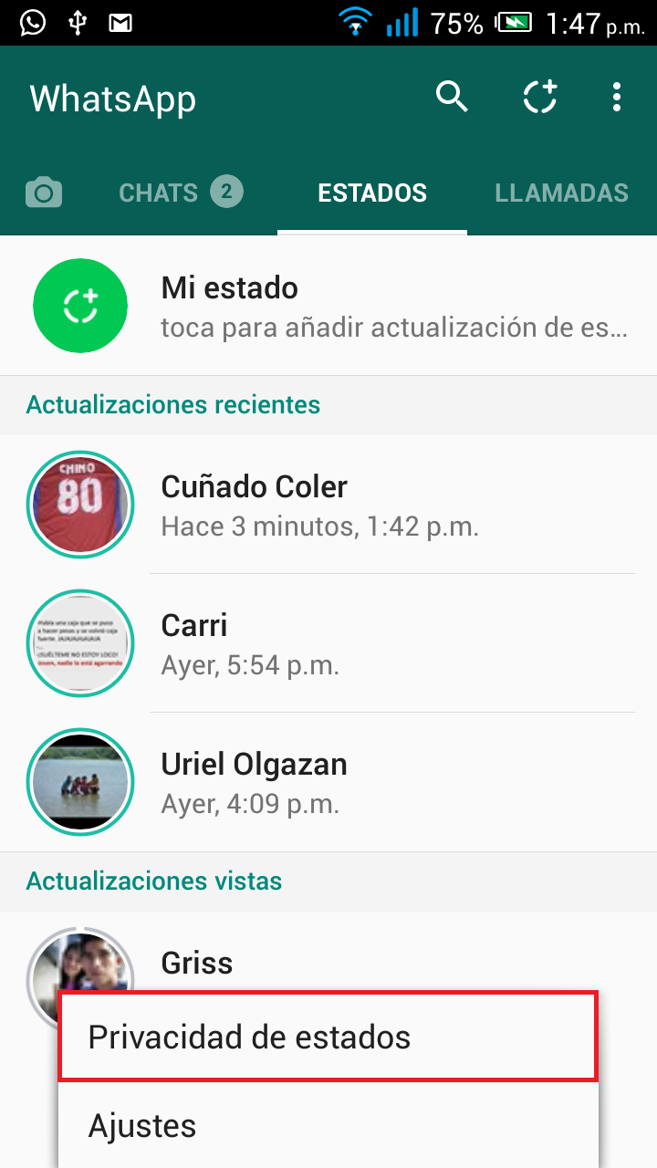 - Si no quieres recibir las notificaciones o actualizaciones de las personas que tienes como contactos debes elegir la última opción y así no sabrás del estado de nadie. Pero si solo lo quieres para unos cuantos entonces elige la segunda opción.
