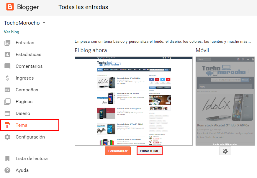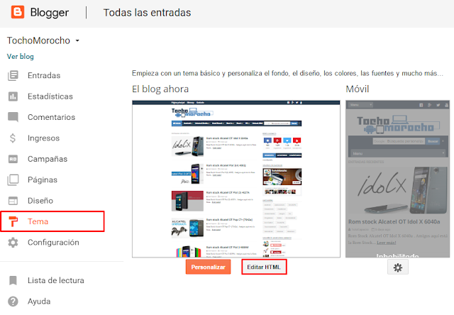 - Como primer paso es obviamente contar con una plantilla de Way2themes instalada en nuestro blog. Después de ello abrir blogger dar clic en la opción de «Tema» y posteriormente en el botón de «Editar HTML» para que se muestre el código de nuestra plantilla.