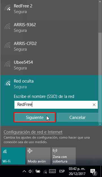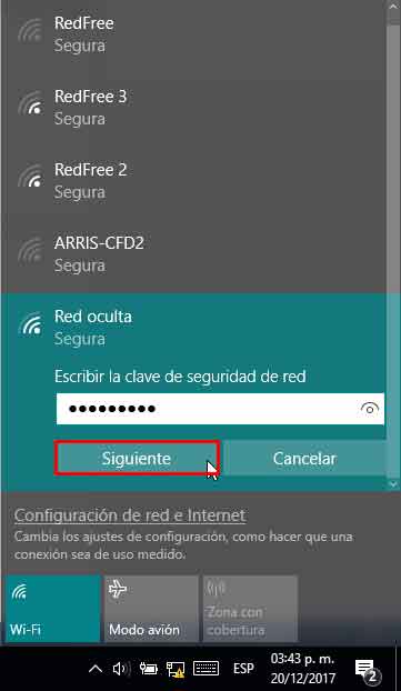 Para conectarse a la red que esta oculta solo debemos hacer unos pasos. Como la red se encuentra oculta debemos introducir el SSID y la contraseña. Así que debemos conocer estos dos parámetros para conectarse a la red inalámbrica oculta.