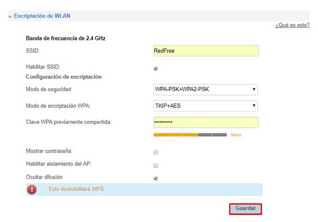 - «Modo de seguridad» elegir la última opción de las que se muestran WPA-PSK+WPA2-PSK [que es la más segura].