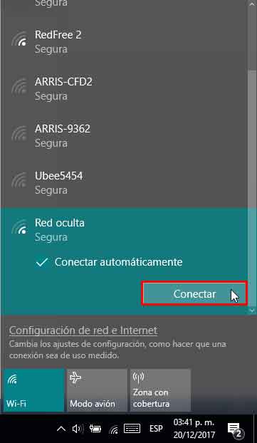En Windows 8, 8.1 y 10 es exactamente lo mismo, nos vamos al área de las notificaciones y clic en el icono de la red. Buscar la red que tenga el nombre de «Red oculta» dar clic en «Conectar«.