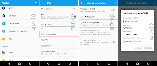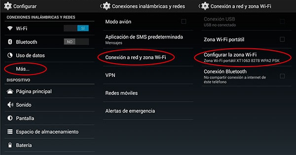 - Proceder a configurar las opciones de la zona Wi-Fi, recuerda que la configuración para cada modelo de teléfono es algo diferente solo es cuestión de ubicarlas y configurar el nombre de la red (SSID), la contraseña, el tipo de seguridad y el máximo de conexiones si lo trae.