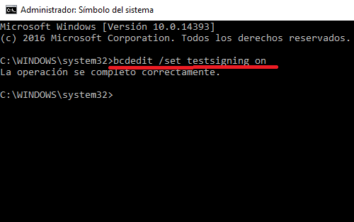 Vamos copiar el siguiente comando: bcdedit /set testsigning on respetando todos los espacios. Pegar en la consola de comandos CMD antes abierta y dar enter. Veras un mensaje indicándote que el comando se ejecutó correctamente.