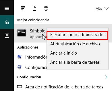 Lo primero que tenemos que hacer será acceder al símbolo del sistema (CMD) como administrador desde nuestro Windows. Buscar el símbolo del sistema en el buscador de Windows y abrirlo como administrador.