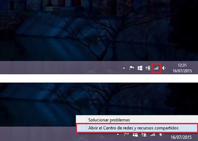 Sabiendo que estamos conectados a la red de la cual queremos saber la contraseña nos iremos al área de las notificaciones [parte inferior derecha de la barra de herramientas] y busca el icono de la red wifi. Aquí dar clic derecho y elegir la opción de «Abrir el Centro de redes y recursos compartidos«.