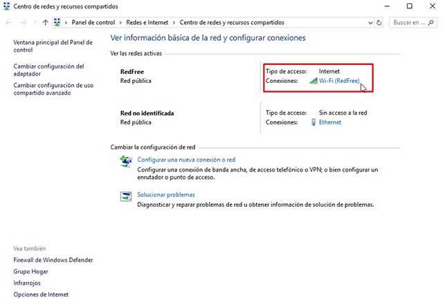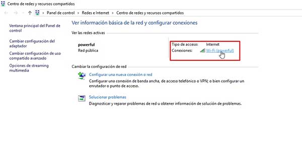 Cuando se abra la ventana del Centro de redes y recursos compartidos lo siguiente es dar clic sobre la red wifi a la que estamos conectados en ese momento.