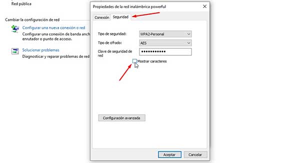 Ahora se muestran las propiedades inalámbricas de la red como la conexión y la seguridad. Procede a elegir la pestaña de «Seguridad«. Luego marca la casilla que dice «Mostrar caracteres«.