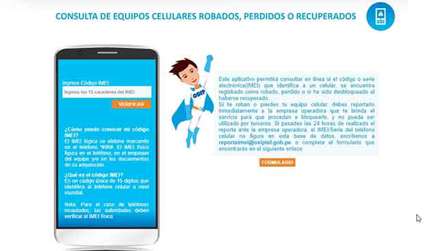 Esta página OSPITEL disponible para el Perú te permitirá consultar en línea si el código IMEI se encuentra registrado como robado o perdido.