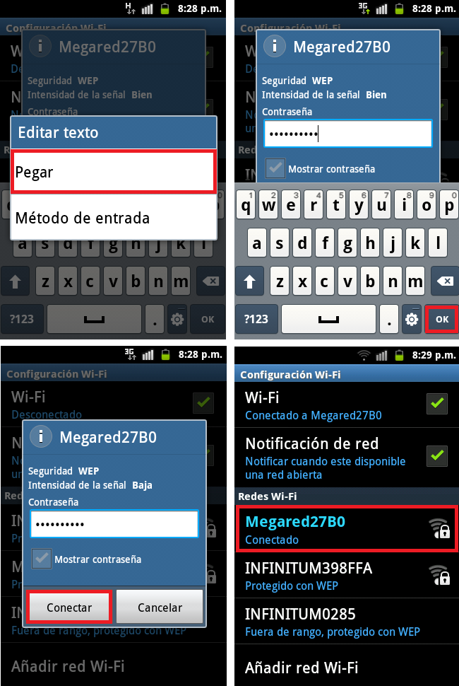 5.- Seleccionamos la red, pegamos la clave y clic en «Conectar». Y así es como nos conectamos.