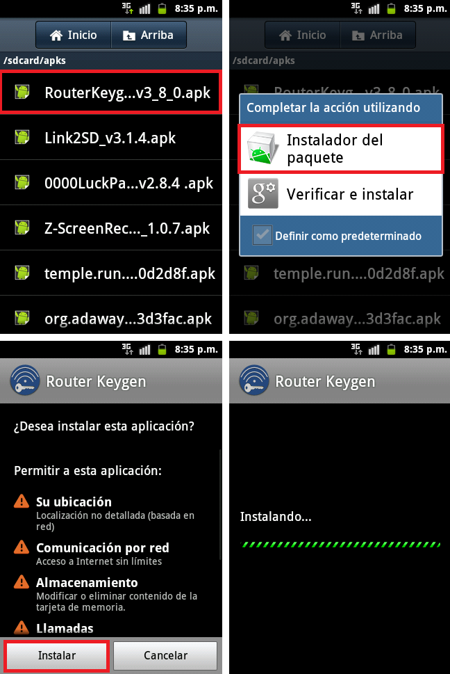 1.- Una vez descargado los dos archivos buscaremos el «RouterKeygen_v3.8.0.apk» y le damos clic sobre ella, después en «Instalador de paquetes» e «Instalar» y esperamos a que se instale.