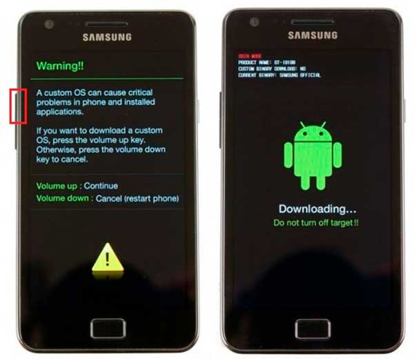 Cuando se visualice en la pantalla del terminal el mensaje de advertencia saltar los tres botones. Ahora bien, aquí solo presionar una vez el botón de subir volumen [VOL+]. Para entrar en modo download o modo descarga.