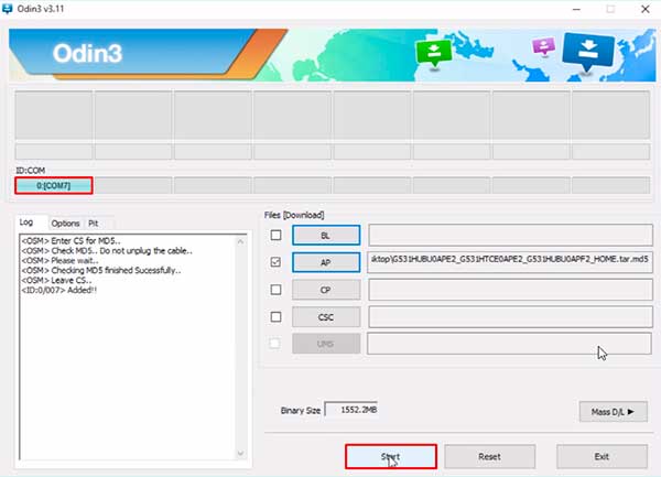Todo está listo en el programa, lo que sigue es conectar el terminal a ordenador mediante el cable de datos. Cuando la herramienta detecte el dispositivo se pondrá una barra de color azul o amarilla [depende de la versión del odin samsung]. Procede a dar clic en el botón «Start«.