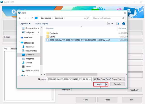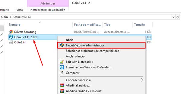 Ahora para saber como flashear con odin samsung vamos a ejecutar el programa en cuestión. Nos vamos a la carpeta que contiene los archivos, ubicar y ejecutar como administrador el archivo Odin3.exe.