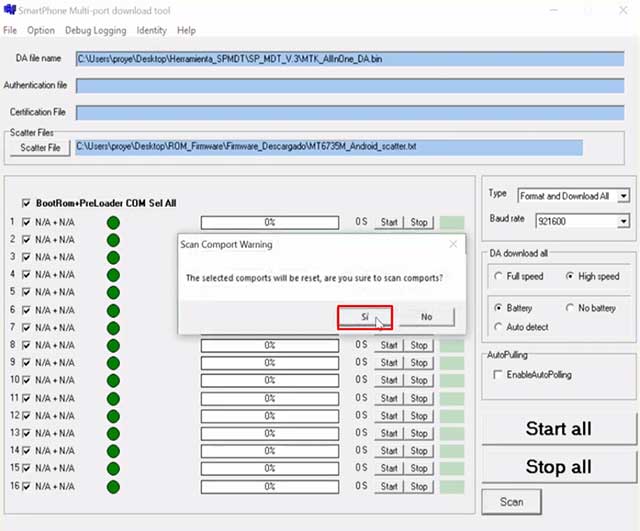 Cuando los archivos DA y Scatter estén previamente cargados en el programa vamos a marcar todas las casillas de la izquierda. Para esto seleccionar la opción «BootRom+Preloader COM Sell All» automáticamente se marcan todas las casillas. Clic en el botón «Scan» en el mensaje en pantalla elige «Si«.
