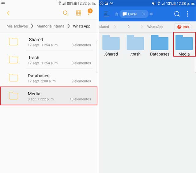 - Ahora accede a la carpeta de «Media» donde se encuentran todas las imágenes enviadas y recibidas, las fotos de perfil, etc.