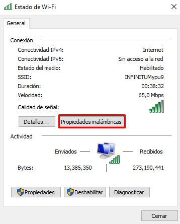 En la ventana que se muestra en pantalla clic sobre la opción de «Propiedades inalámbricas«.
