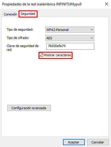 Como último paso, en la ventana que nos aparece nos vamos a la pestaña de «Seguridad» y marcamos la casilla «Mostrar caracteres«. La contraseña de la red a la que estamos conectados se mostrará automáticamente.