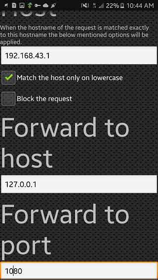 - Nos pasamos a la otra pestaña de Rules y aquí presionar el botón de «Add» y configurar las siguientes opciones de esta manera: En «Host» escribir la dirección «192.168.43.1«. En «Forward to host» colocar la dirección «127.0.0.1» y por último en «Forward to port» escribir el puerto «1080«.