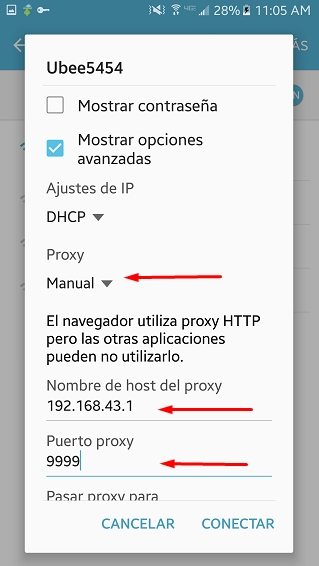 - En los ajustes de las opciones avanzadas elegir «Proxy» manual, en el «Nombre de host» escribir la dirección ip «192.168.43.1» en «Puerto proxy» poner el proxy «9999» y por ultimo dar clic en «CONECTAR«.