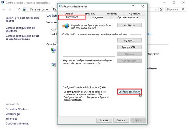 - Una vez estando en las opciones de internet elegir la pestaña de «Conexiones» y después clic en el botón de «Configuración de LAN«.