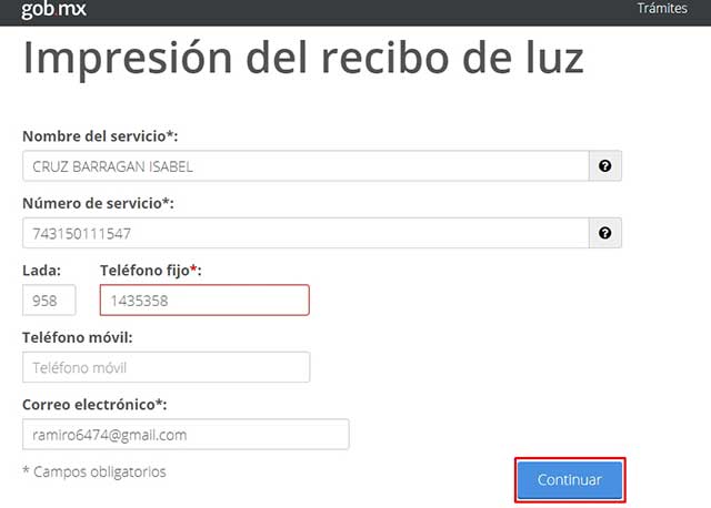 Ahora vamos a acceder a la página Impresión del recibo de luz. Aquí vamos a rellenar los campos que tienen un * los cueles son los importantes. Colocar Nombre del servicio y Número de servicio. Teléfono fijo y Correo electrónico.