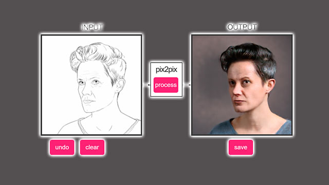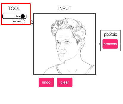 - También ofrece botones los cuales dos están ubicados debajo del área de trabajo donde se realiza el boceto, un botón de Undo el cual realiza la función de deshacer el último cambio hecho y el botón Clear que como su nombre lo dice permite borrar todo el trazo que se ha hecho. También se cuenta con un botón de Process el cual permite digitalizar el boceto antes realizado y genera la imagen automáticamente.