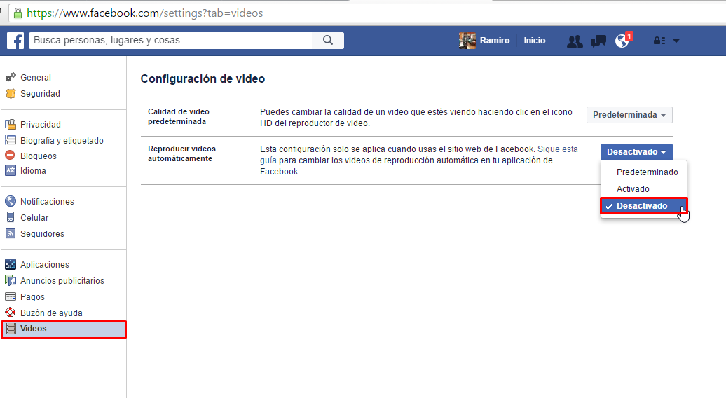 - Una vez estando en las configuraciones vamos hasta la opción de “Vídeos” y del lado derecho en la Configuración de video en la segunda opción que dice “Reproducir vídeos automáticamente” procedemos a desactivar esa opción.