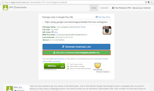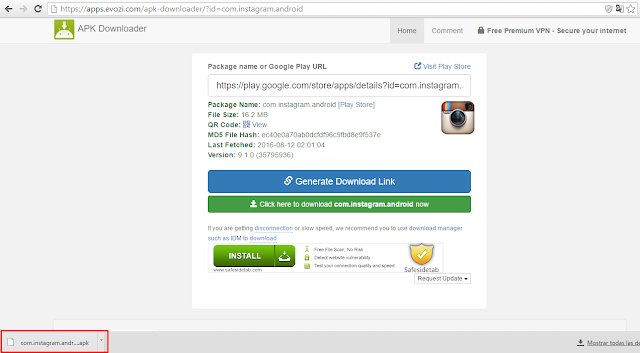 - Se mostrará unas pequeñas características de la aplicación como nombre y tamaño, presionar sobre el botón de “Click here to download com.instagram.android” y dejar que se descargue la aplicación o juego.