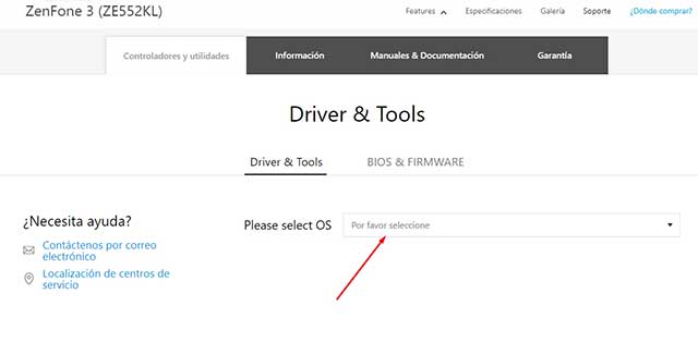 Ahora bien, en la siguiente página que se abre en el navegado ubicar el apartado de «Driver & Tools«. Aquí procede a buscar «Please select OS» y de las opciones que se te muestran elegir el sistema Android.