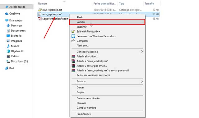 Descomprime el archivo, te encontrarás con los controladores para Windows XP, 7, 8 y 8.1 que igual funciona para Windows 10. Elige cualquier carpeta ya sea MTP, Android, etc. Dentro de cada una se encuentra un archivo con la extensión [.inf], los cuales pueden ser asus_wpdmtp.inf, android_winusb.inf o asus_tethering.inf. Ahora da clic derecho sobre el archivo que quieras instalar y elige «Instalar«.