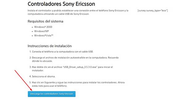 Para descargar los controladores USB entrar a la página de Sony. Te vas a tomar con un pequeño tutorial. En la parte de abajo vamos a dar clic en el botón azul que dice «Descarga los controladores Sony Ericsson«.