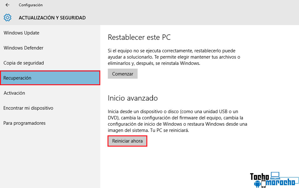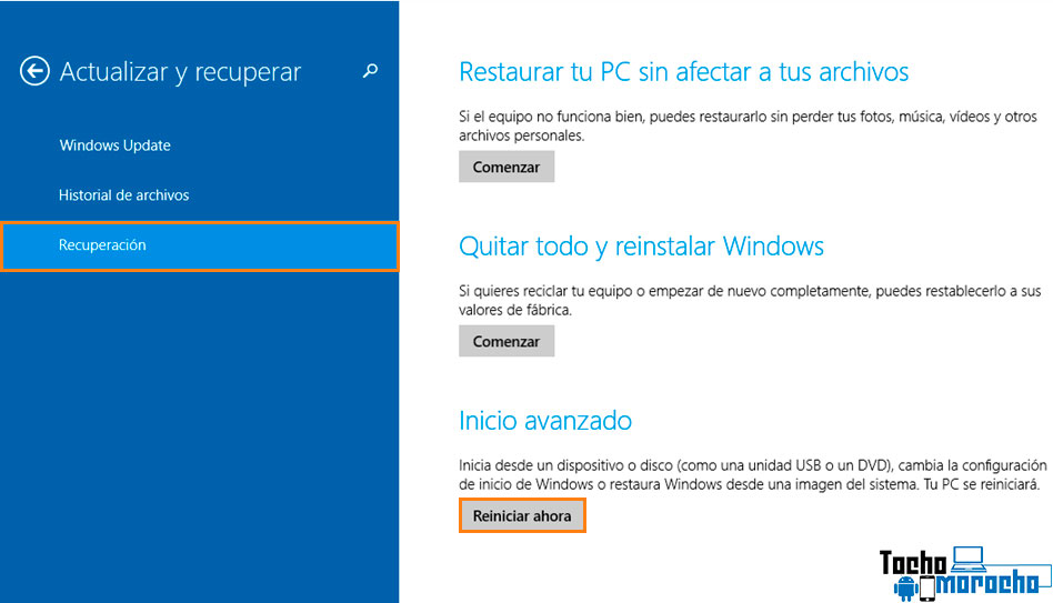 En Windows 10 damos clic en el botón de inicio y vamos a «Configuración«, después a «Actualización y seguridad» estando ahí elegimos «Recuperación» y en el apartado de Inicio avanzado damos clic en «Reiniciar ahora«. Esperamos a que la PC se reinicie.